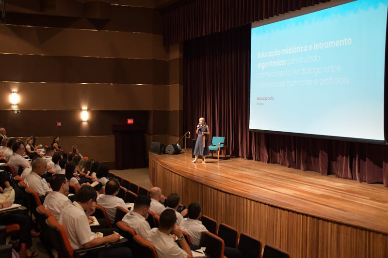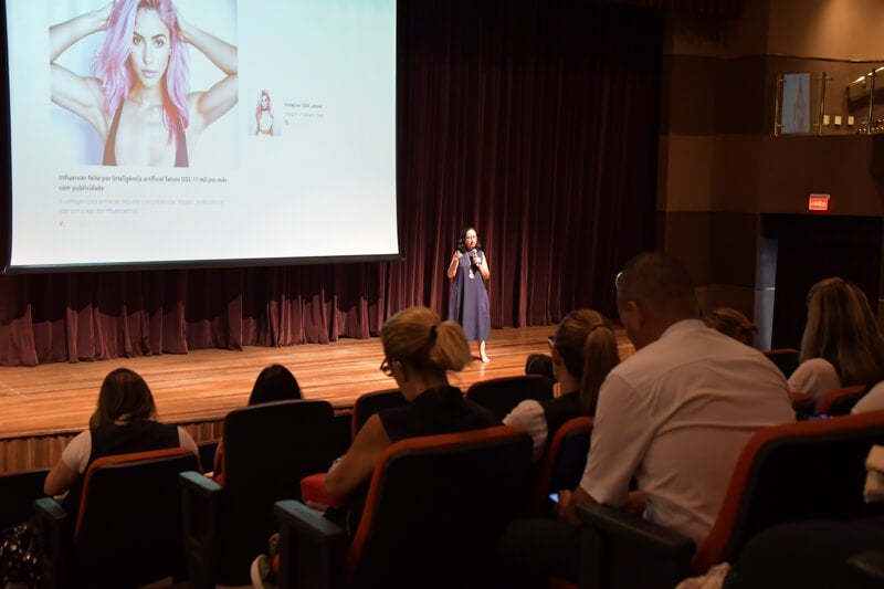 Abrindo o primeiro dia, o público foi contemplado com uma palestra apresentada por Mariana Ochs destacando aspectos muito relevantes sobre a educação midiática e como construir conhecimento através do diálogo entre inteligências humanas e artificiais. Em seguida, Paula Carolei subiu ao palco do Teatro Engenheiro Salvador Arena para falar sobre a inteligência artificial como apoio para a criatividade humana.