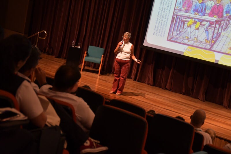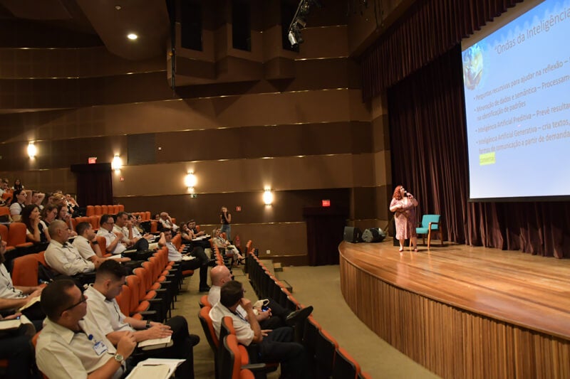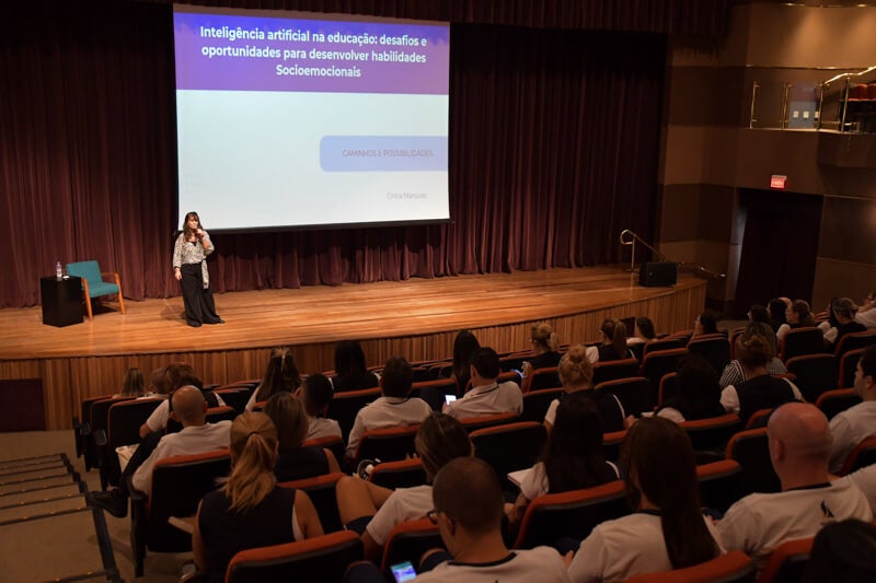 Dando continuidade ao Simpósio, no segundo dia os participantes tiveram a oportunidade de assistir a uma palestra sobre inteligência artificial na educação e os desafios para desenvolver habilidades socioemocionais, ministrada por Cintia Marques; em seguida, Mariana Gonçalo propôs aos presentes uma reflexão sobre as tendências e competências para a vida no futuro, em tempos de inteligência artificial.